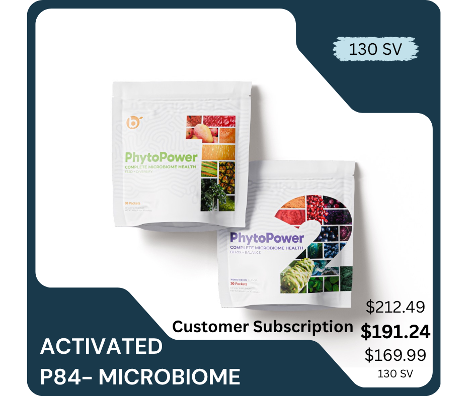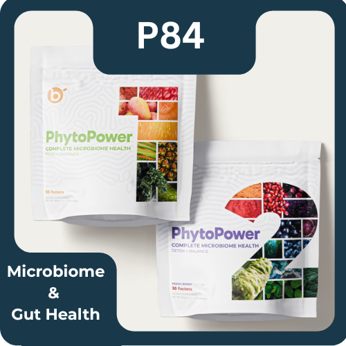 3. P84 is comprised of two products: PhytoPower 1, and PhytoPower 2. PhytoPower 1 is designed to help you feed and diversify your microbiome with phytonutrient blends, Targeted Probiotics®, and digestive enzymes. PhytoPower 2 is designed to help you detoxifyand balance your microbiome with fermented foods, superfoods, probiotics, and postbiotics.